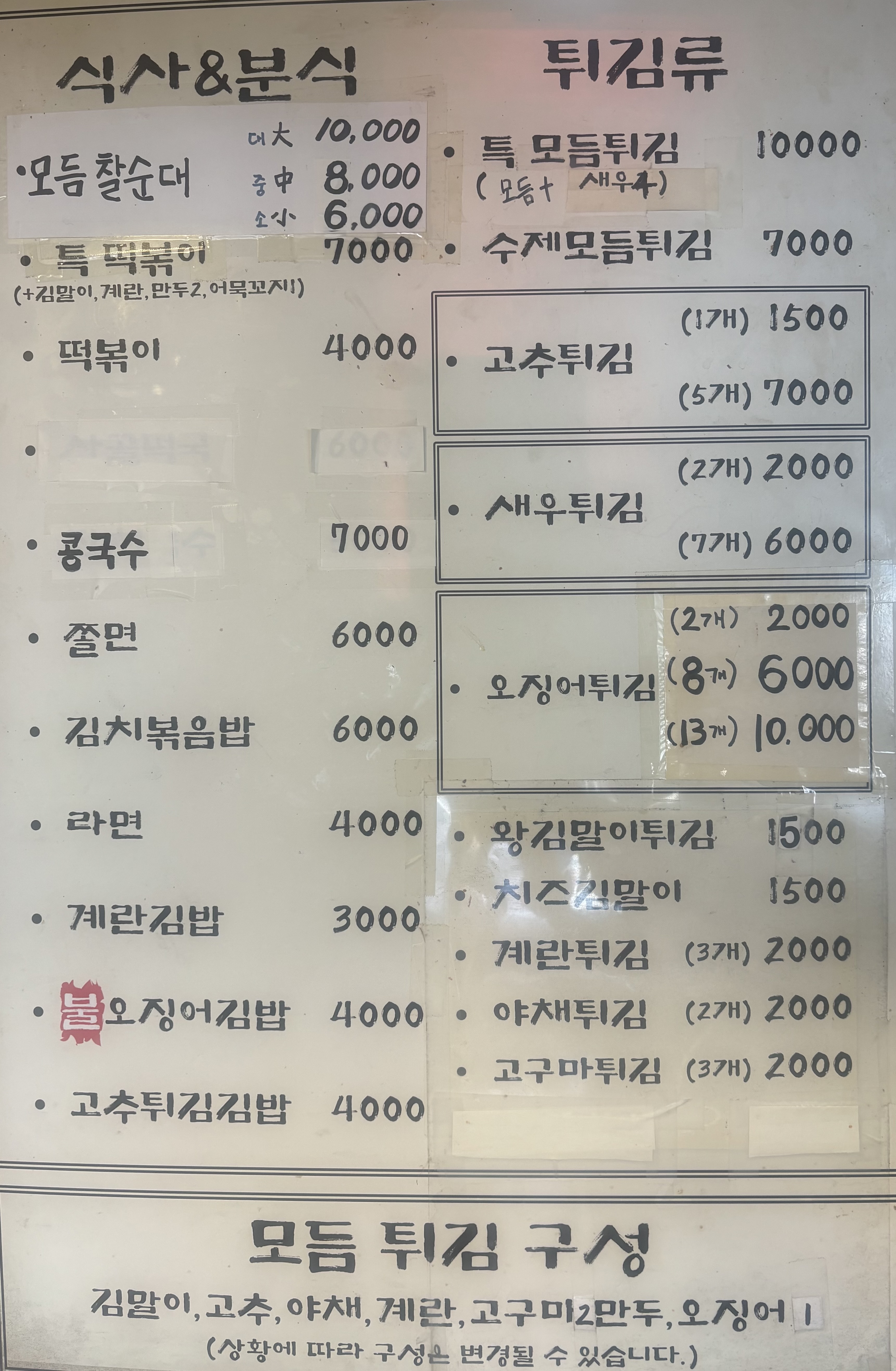 계란김밥;일반김밥;고추튀김김밥;불오징어김밥;떡볶이;모듬 찰순대;잔치국수;수제모듬튀김;쫄면;어묵(1인분);특떡볶이;