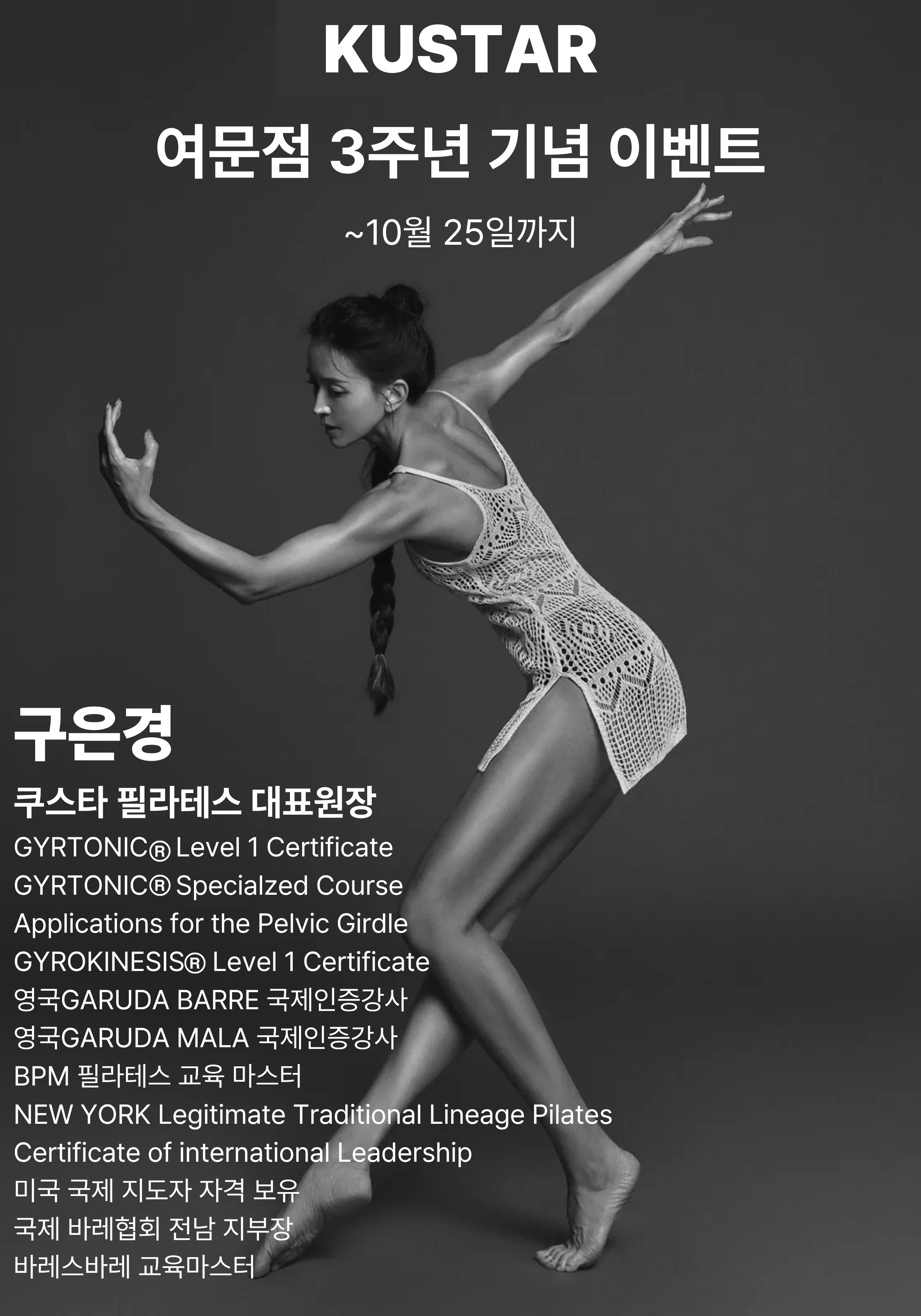 3주년 기념 33회;3주년 기념 100회+3회;3주년 기념 개인3+그룹33;10월 3주년 이벤트 블로그 업데이트;토요일 저녁 수업 오픈;바레 24회 월,수 7시 고정제;경력 8년 이상 원장급 강사진 다수;필라테스,가루다,자이로키네시스,바레;다양한수업을 즐길수있는 여수 유일한곳;25년 경력의 원장 그룹 직강;여수에서 유일한 필라테스 평생교육원;누적 회원 수 …