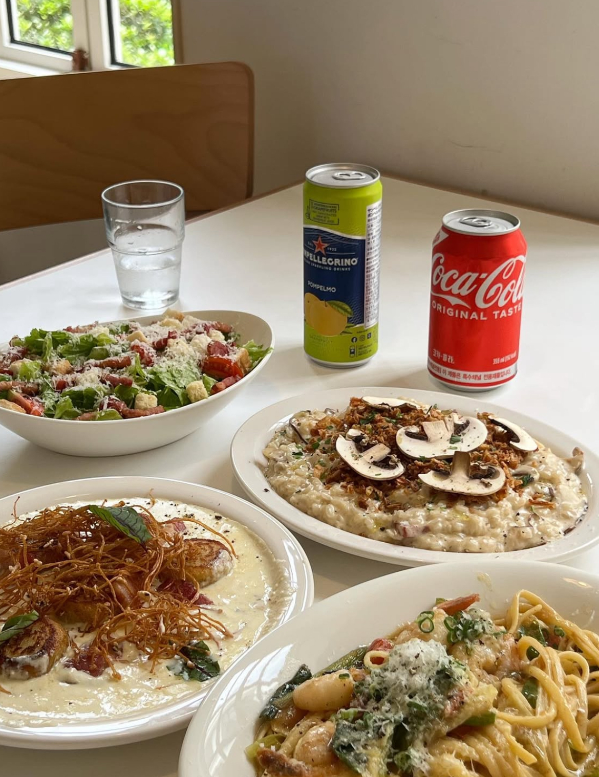 옥수수 크림 뇨끼;새우 오일 링귀니;꼬또 크림 리가토니;토마토 스파게티;버섯 크림 리조또;시저 샐러드;채끝 스테이크;