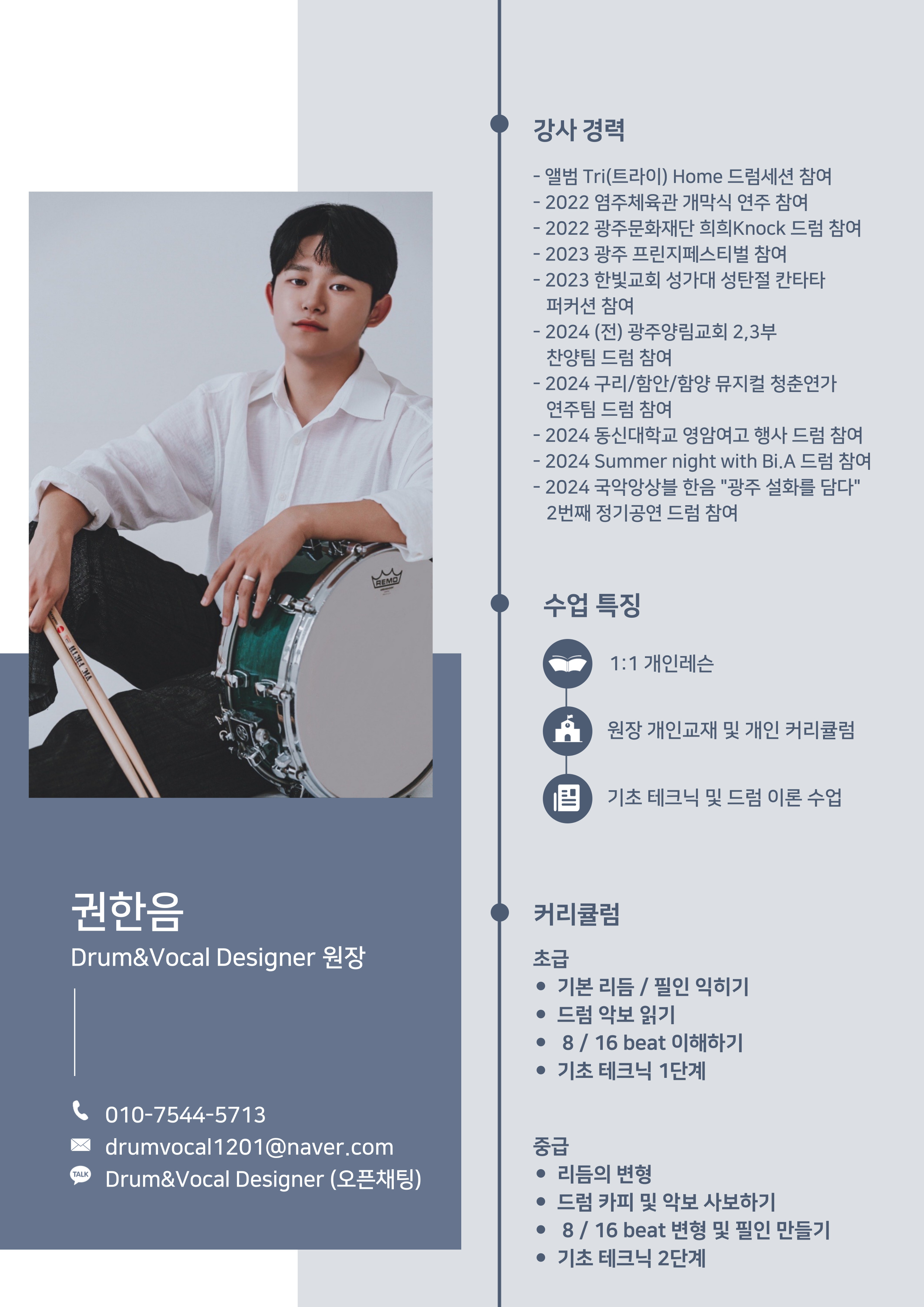 (토요일 오전) 주 1회 50분;(초등저학년) 주 2회 50분;드럼 / 보컬 주 2회 30분;드럼 / 보컬 주 1회 30분;드럼 / 보컬 주 1회 50분;