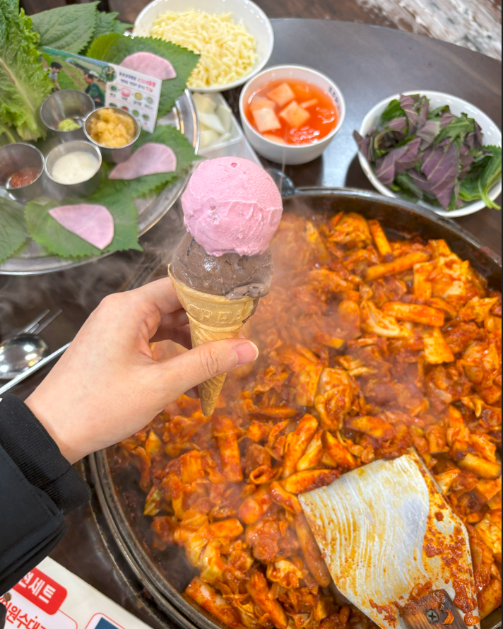 후식아이스크림;2인 알쌈세트;무쇠주물 철판닭갈비;날치알 생와사비 쌈 세트주문시무료;각종사리 2500부터;방앗간 참기름 볶음밥;한라산 치즈 볶음밥;