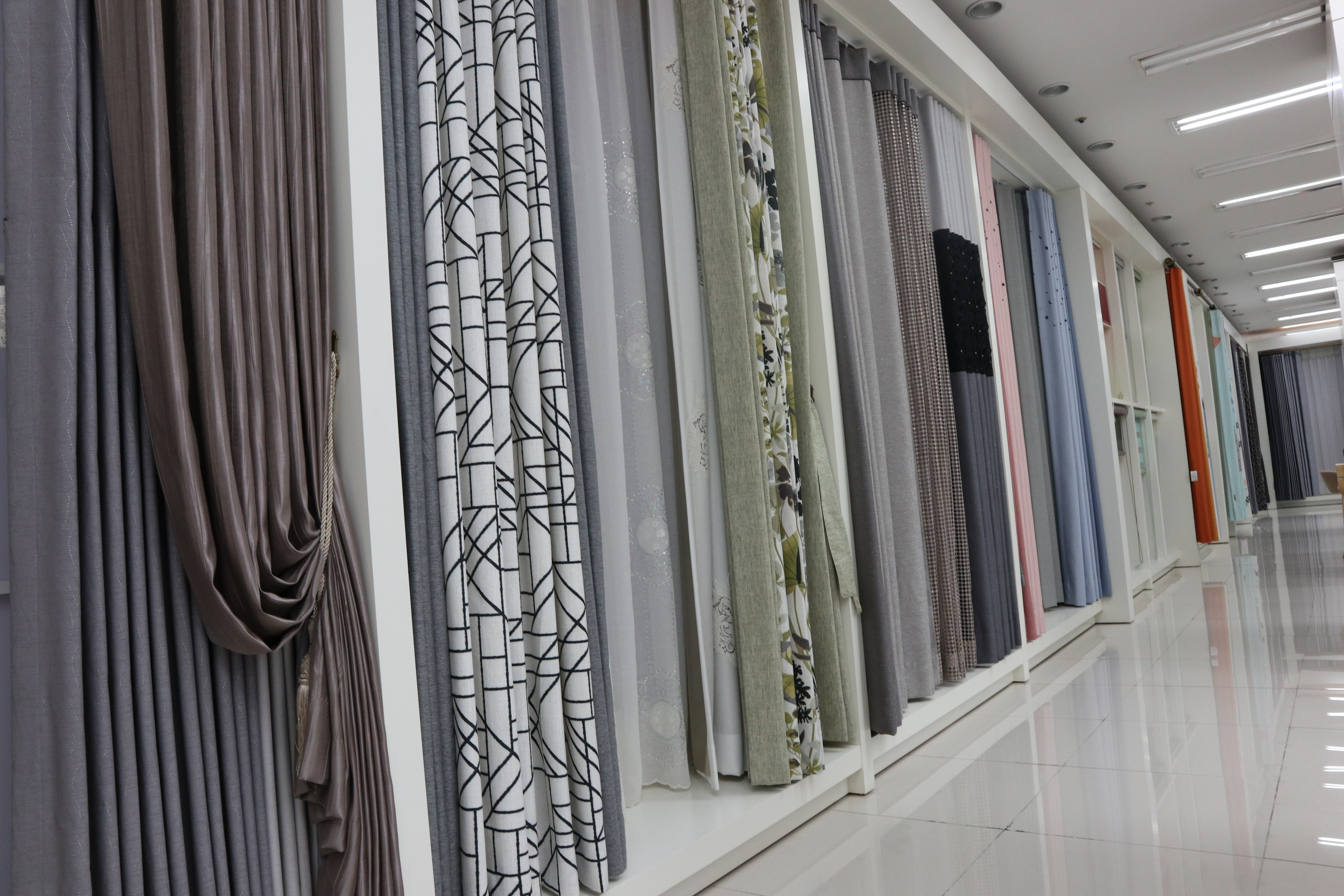 [대표 제품] 커튼: 다양한 디자인과 재질의 커튼을 제공합니다. 암막 커튼, 레이스 커튼, 일반 커튼 등 여러 종류가 있으며, 색상과 패턴도 다양합니다.