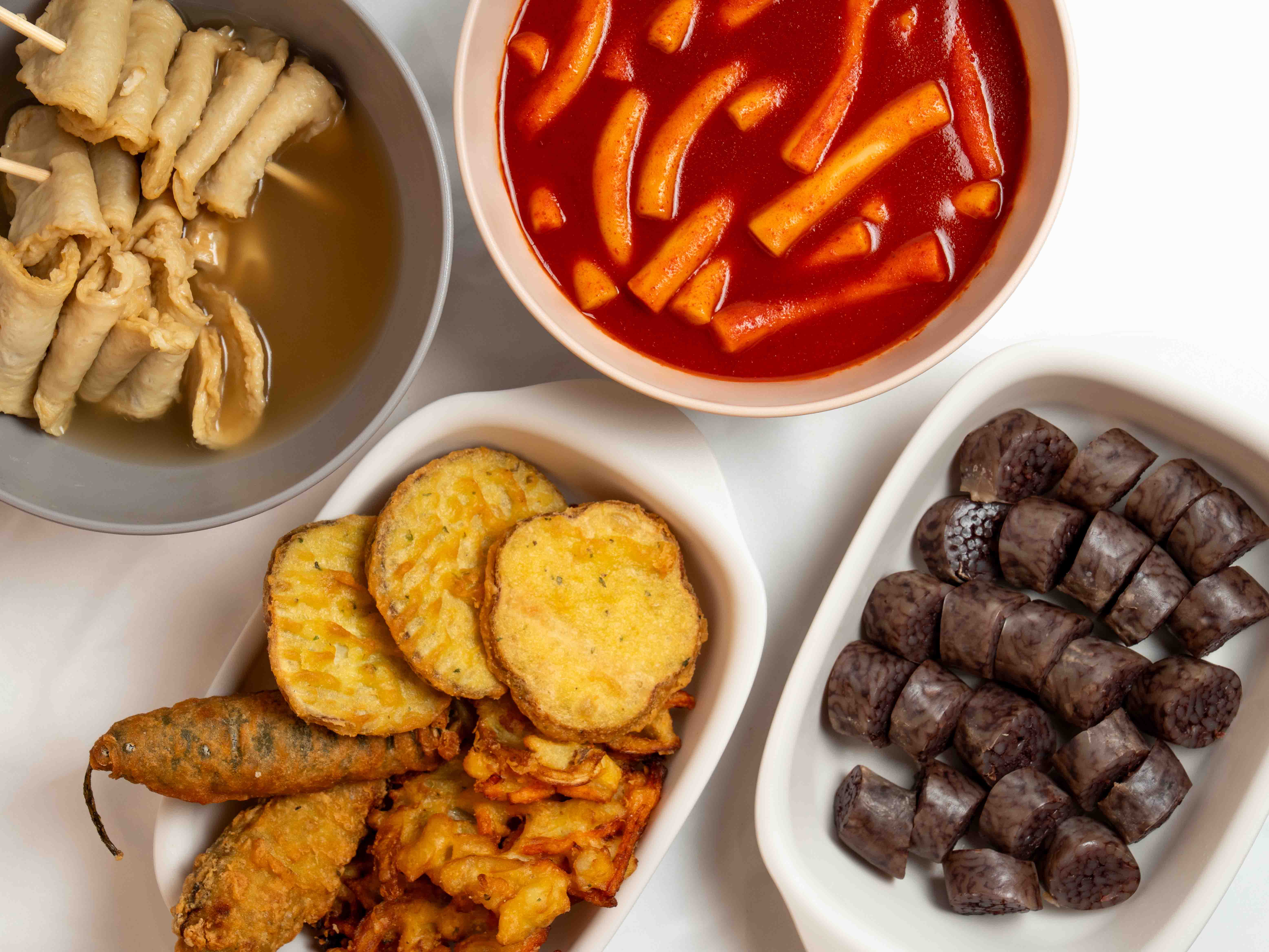 밀떡볶이;쌀떡볶이;꼬마김밥;고추,김밥,김말이,고구마 튀김;새우, 오징어 튀김;순대;