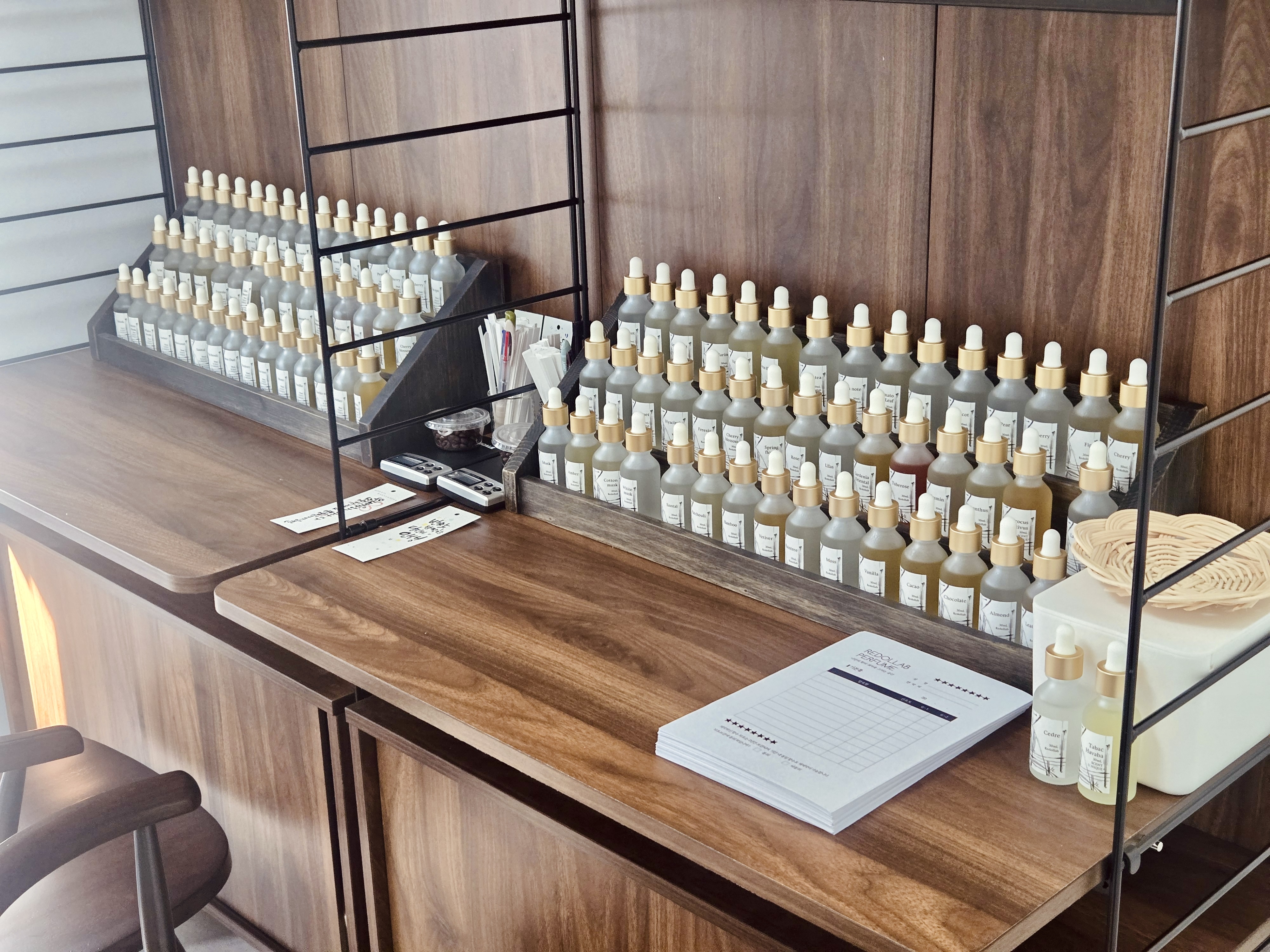 맡을 수 있는 향료 중에 골라서 제 맘에 꼭 드는 향수를 처음으로 만들었어요!