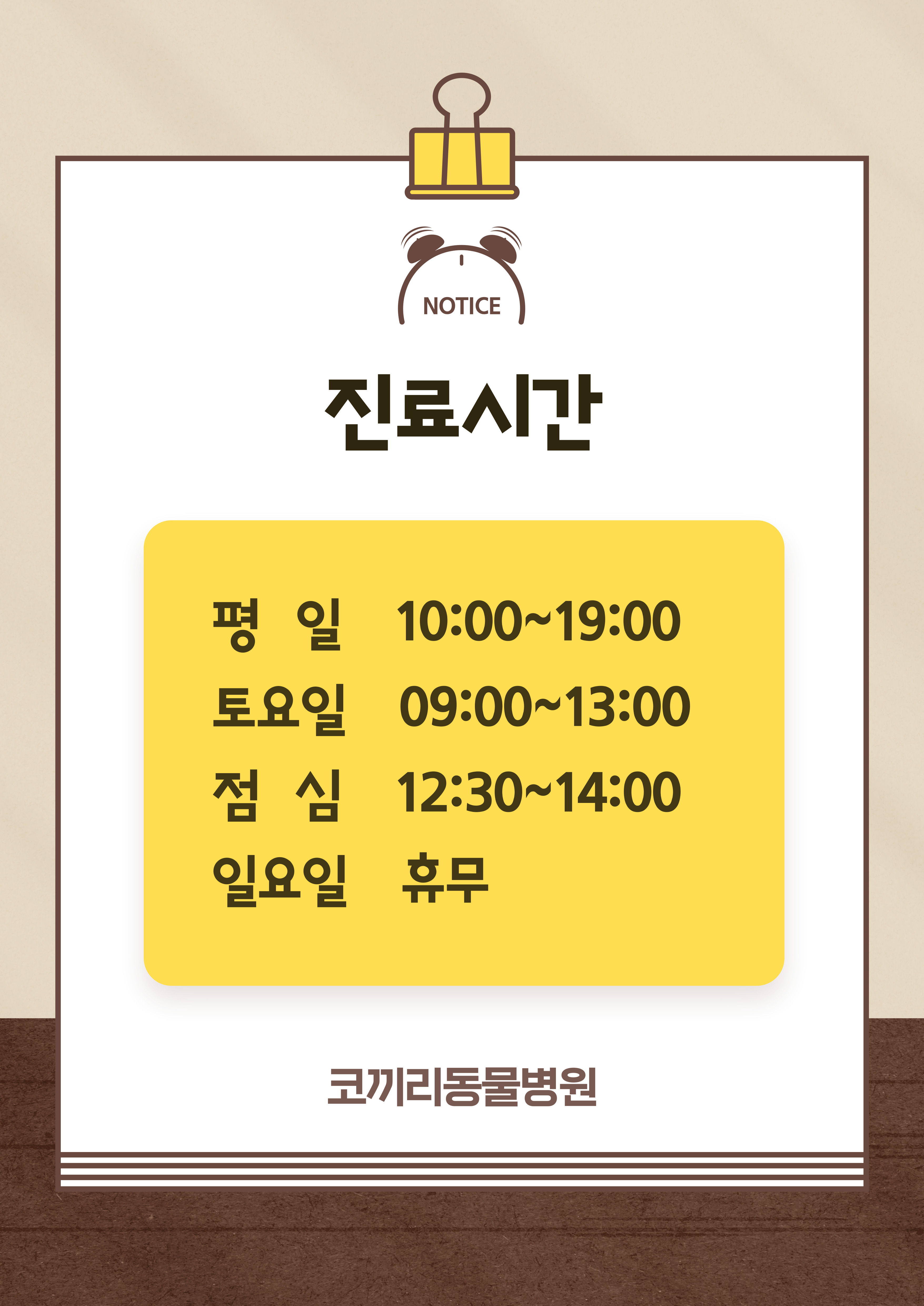 업무시간 : Day: 수, Start: 10:00, End: 19:00Day: 목, Start: 10:00, End: 19:00Day: 금, Start: 10:00, End: 19:00Day: 토, Start: 09:00, End: 13:00Day: 월, Start: 10:00, End: 19:00Day: 화, Start: 10:00, End: 19:00