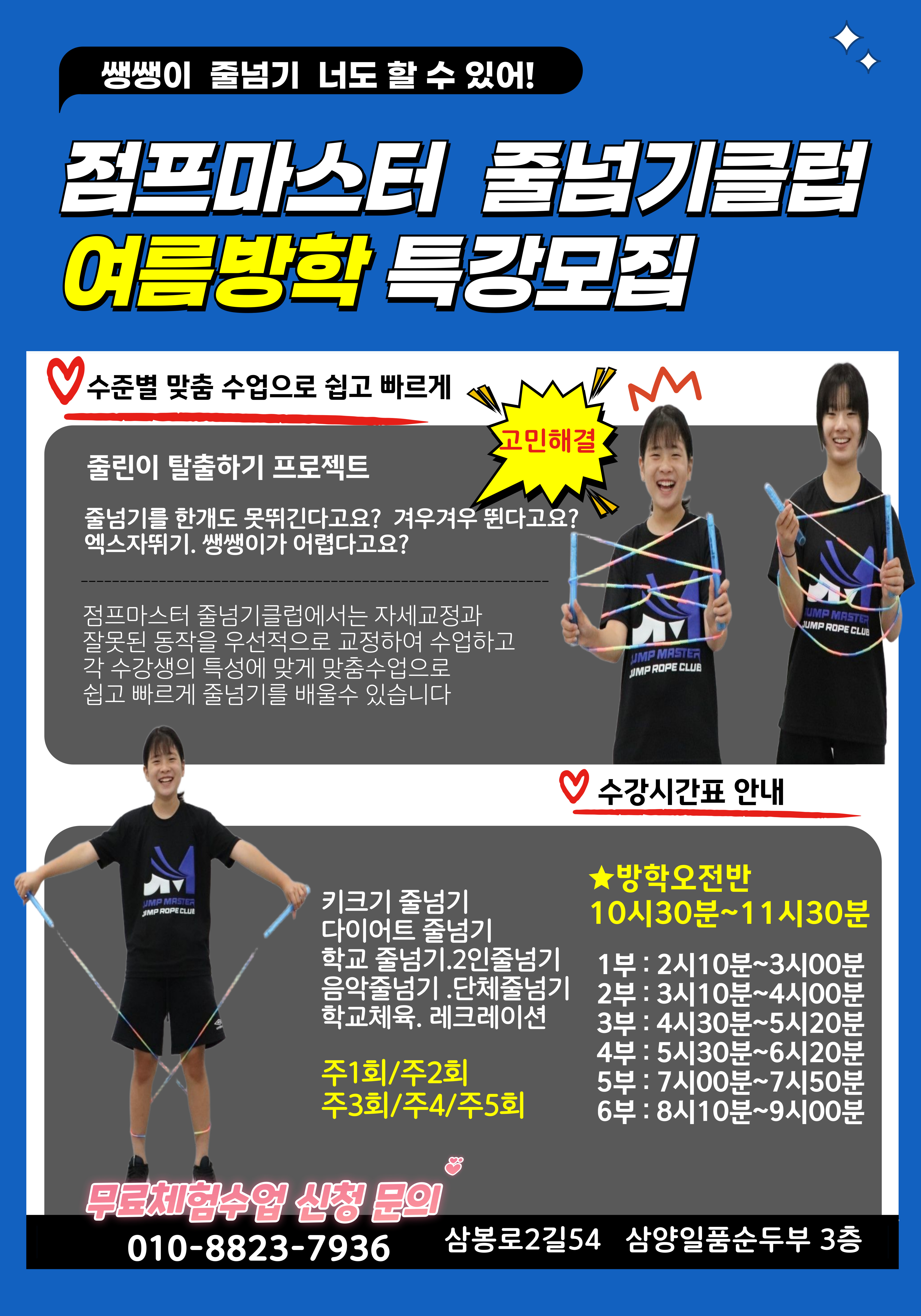 주소 : 제주 제주시 삼봉로2길 54 3층 점프마스터 줄넘기클럽 본관