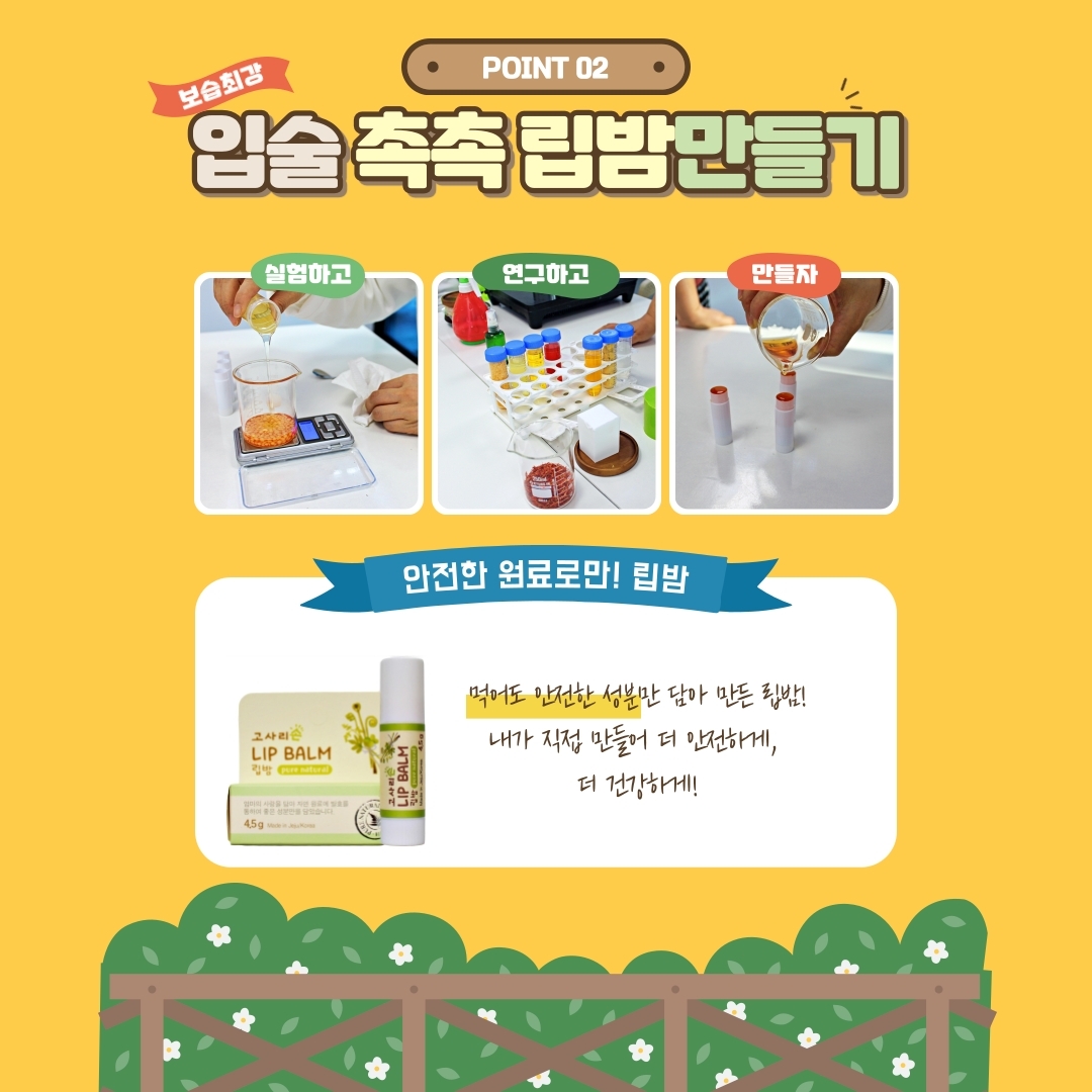 아이랑 함께한 제주도여행 첫번째 체험! 아주 유익하고 즐거운 체험이었어요. 설명도 너무 자세히,아이 눈높이에 맞춰 차근차근 설명해 주셔서 혼자서도 잘 할수 있어요^^  천연 재료만 사용해서 만든 립밤과 비누아주 좋아요~~~