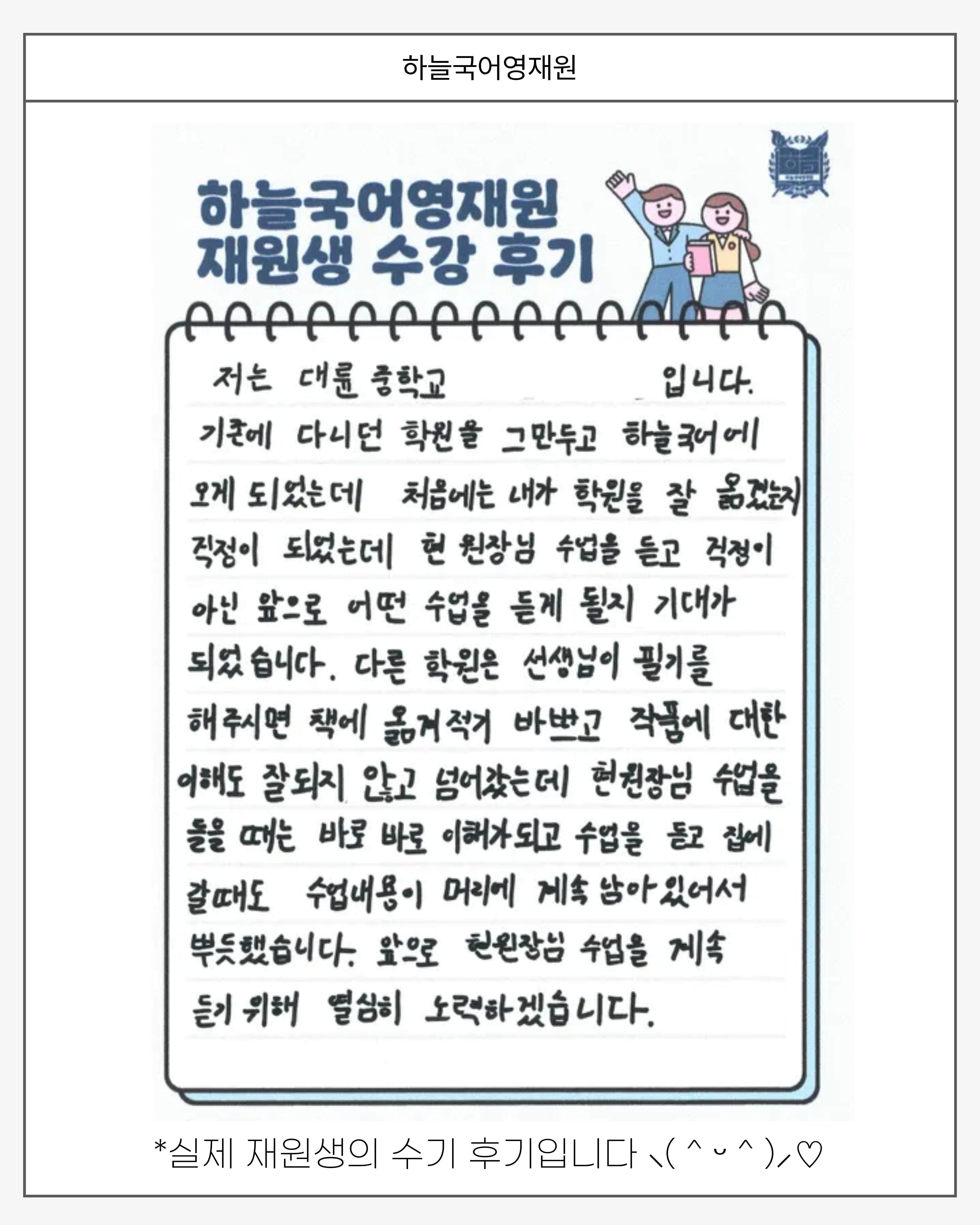 국어 실력의 중요성을 많이 느끼게 되어 여러 학원을 알아보다가 하늘국어영재원을 알게 되서 입학 테스트를 봤어요.