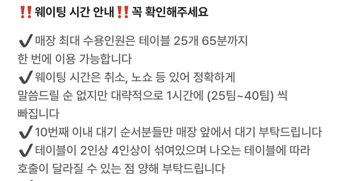주말기준 10시이전에 가면 웨이팅 적당하지만 이후로는 순식간에 늘어납니다.