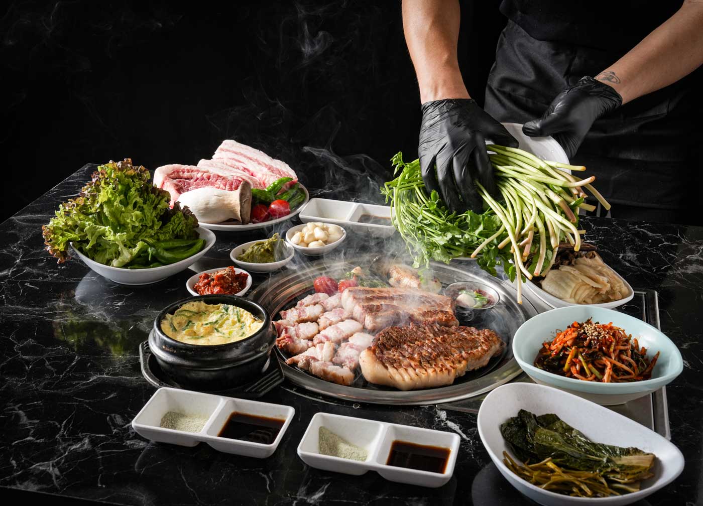 교차熟成)시그니처세트;교차熟成) 특삼겹살;교차熟成) 특목살;340本삼겹살;갈매기살;천겹살;양념껍데기살;된장찌개;경상도식된장술밥;살얼음김치말이국수;재래식 칡 냉면;게딱지비빔밥;날치알톡톡버터간장밥;속초홍게라면(겨울한정);