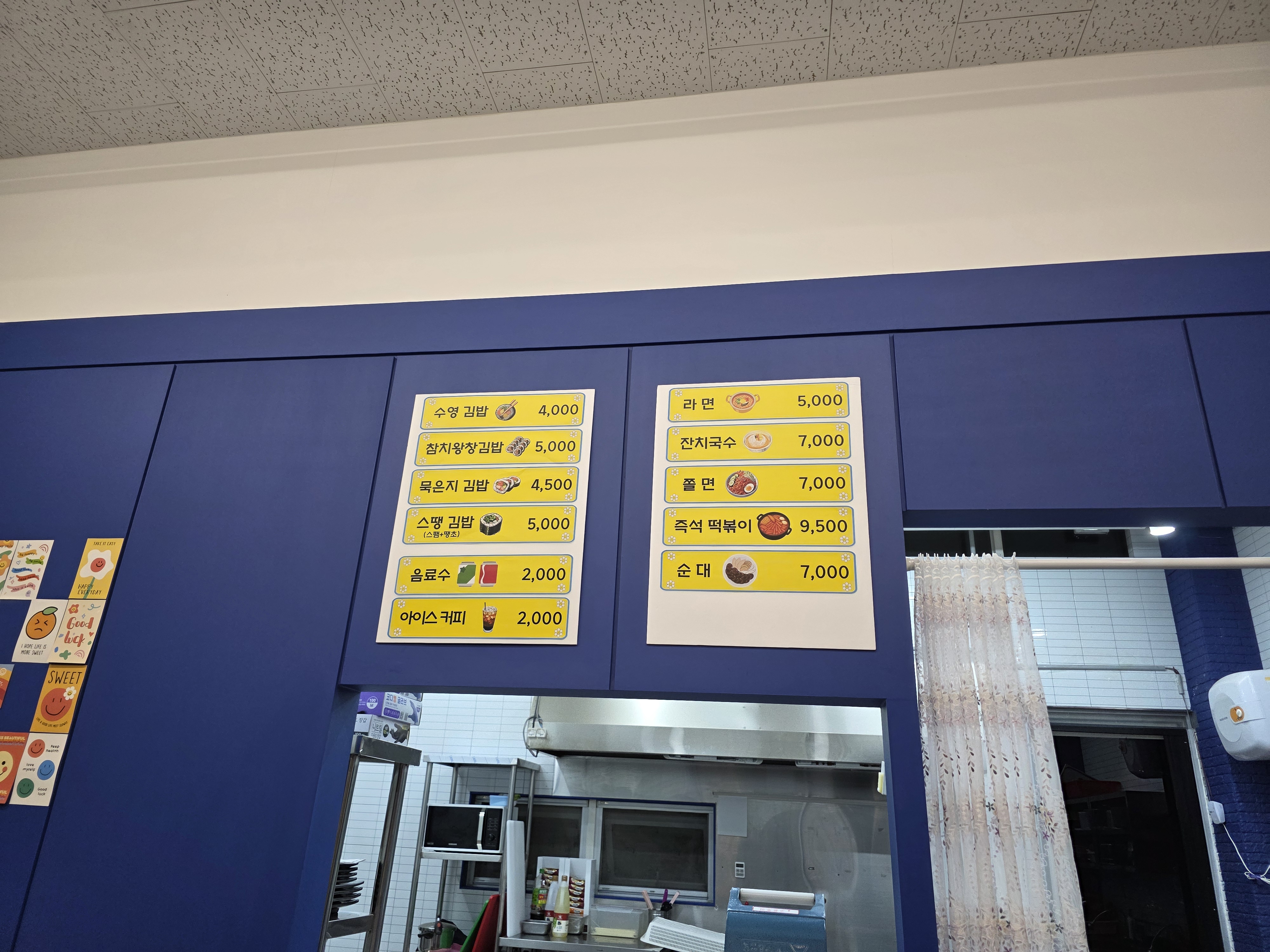 참치땡초김밥;순대;즉석떡볶이;쫄면;잔치국수;라면;스땡김밥;묵은지김밥;참치왕창김밥;수영김밥;