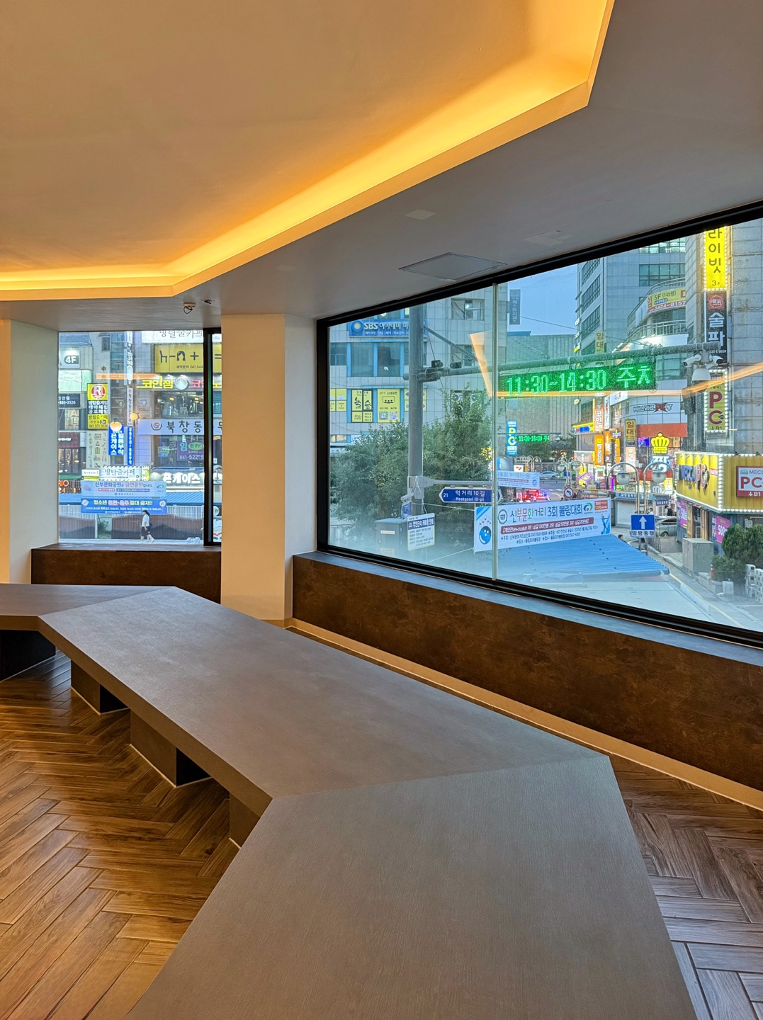 편한 의자는 아니지만 좌식으로 앉는 자리도 있고, 좌석 간격은 넓어요. 휴일 낮 방문이라 소리가 좀 울렸지만 사람 적을 때 오면 한적하게 창가 보면서 즐기기 좋을 듯
