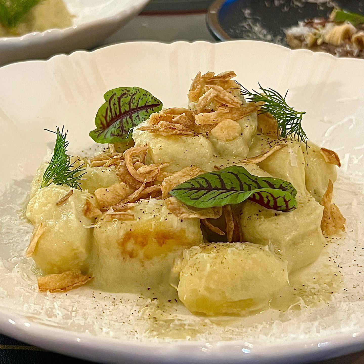 오스테리아우는 술과 함께 먹을 때 더 빛나는 선술집. 가지튀김은 기름기 과하지 않고 속살이 촉촉해 스타터로 적당하지만 기본 칠리소스는 평범해 소금이나 레몬 조합이 있다면 더 낫지 싶다. 뇨끼는 말캉한 식감이 매력이나 이번엔 옥수수 과자 같은 단맛이 올라와 호불호 여지가 있었다. 오늘의 베스트는 빠께리 파스타와 꽃게된장찌개. 빠께리는 오래 두어도 불지 않아 술자리 안주로 탁월했고, 꽃게된장찌개는 게 내장이 녹아든 감칠과 적절한 익힘으로 숟가락을 멈추기 어렵다. 화이트 라구 파스타는 지난 방문과 유사하게 안정적. 전체적으로 간이 과격하진 않지만 조합 자체가 술을 부르는 방향이라 식사보단 마시는 자리에 추천한다. 또한, 사장님이 술을 좋아하시니 페어링 추천을 부탁한다면 아마 만족할만한 인생와인을 찾으실지도.