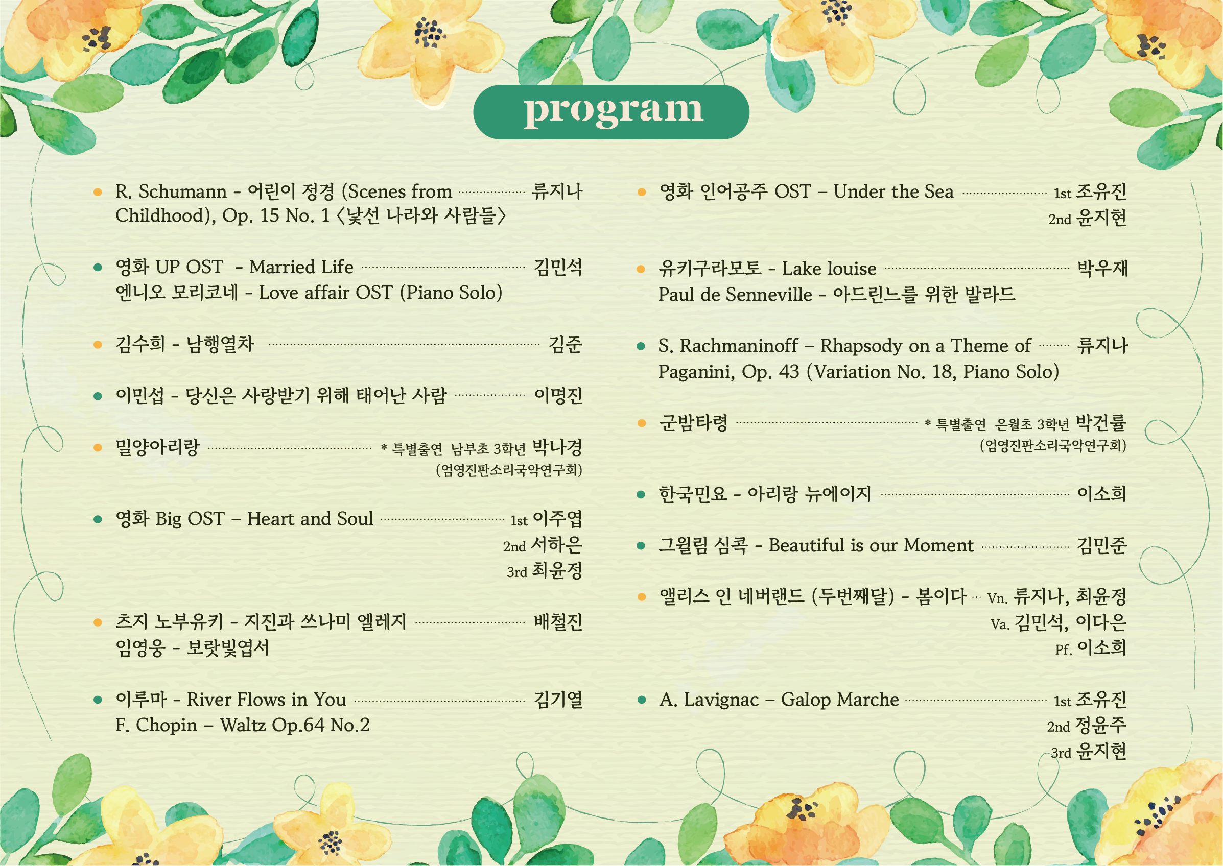 어릴 때 배웠던 피아노를 성인이 되어 배우고 싶어 다니는데, 낯선 감각도 금방 깨울 수 있었고 부족한 부분을 이해하기 쉽게 알려주셔서 집중적으로 연습할 수 있습니다. 또한, 학생들 개개인 수준에 맞게 지도해주시기에 무리없이 꾸준히 배울 수 있습니다. 무엇보다 연습실을 어느 시간대에나 쓸 수 있다는게 큰 메리트예요! 가정에서는 사실 소음 문제 때문에 연습하기 힘든데, 눈치보지 않고 언제든 연습할 수 있습니다. 학원 자체적으로 개최하는 연주회도 종종 있는데, 연주회를 목표로 연습하면 더 재밌고 실력도 키울 수 있습니다. 취미를 갖고 싶으신 분들, 실력을 늘리고 싶은 분들도 즐겁게 다니기 좋습니다.