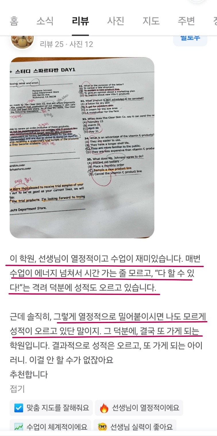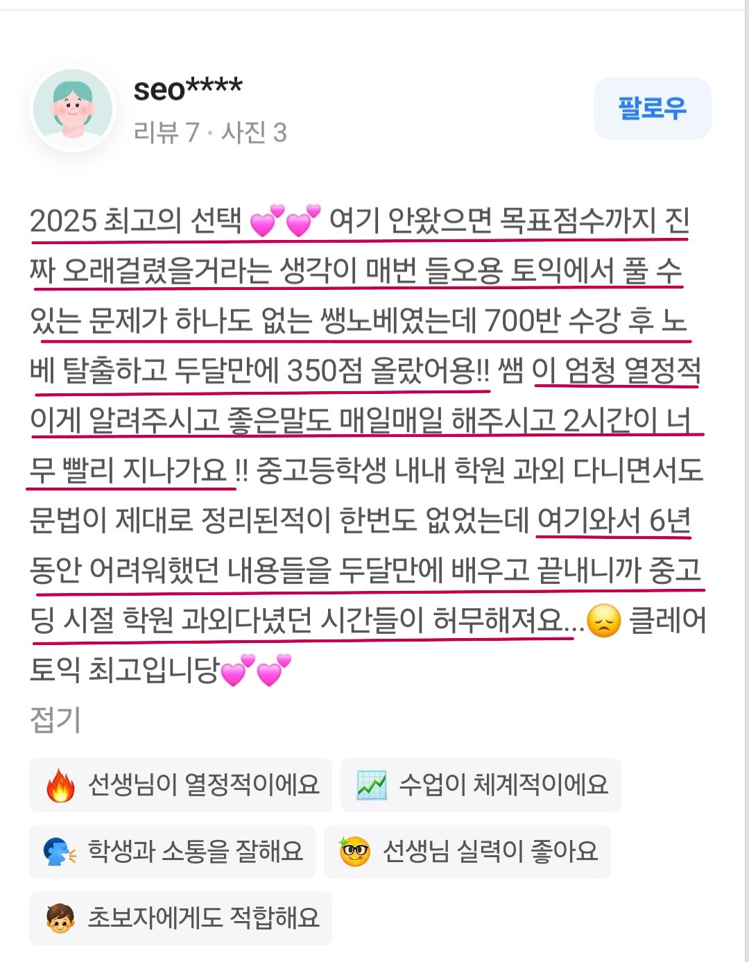 할리갈갈 작성일영어 못해도 클레어 선생님 수업 들으면 토익 고득점 가능해집니다!! 자료 퀄리티도 어디서 못 구할 만큼 고퀄이고 하나하나 선생님께서 만드신다던데 정말 레어해요 ~~ 수업 말고도 스터디도 해주는데 도움 많이 되었어요!!! 혼자 공부할 수 있게 숙제도 많고, 못 나온 날은 영상 강의까지 들을 수 있어서 정말 도움됐습니다~~~ 감사합니다~~