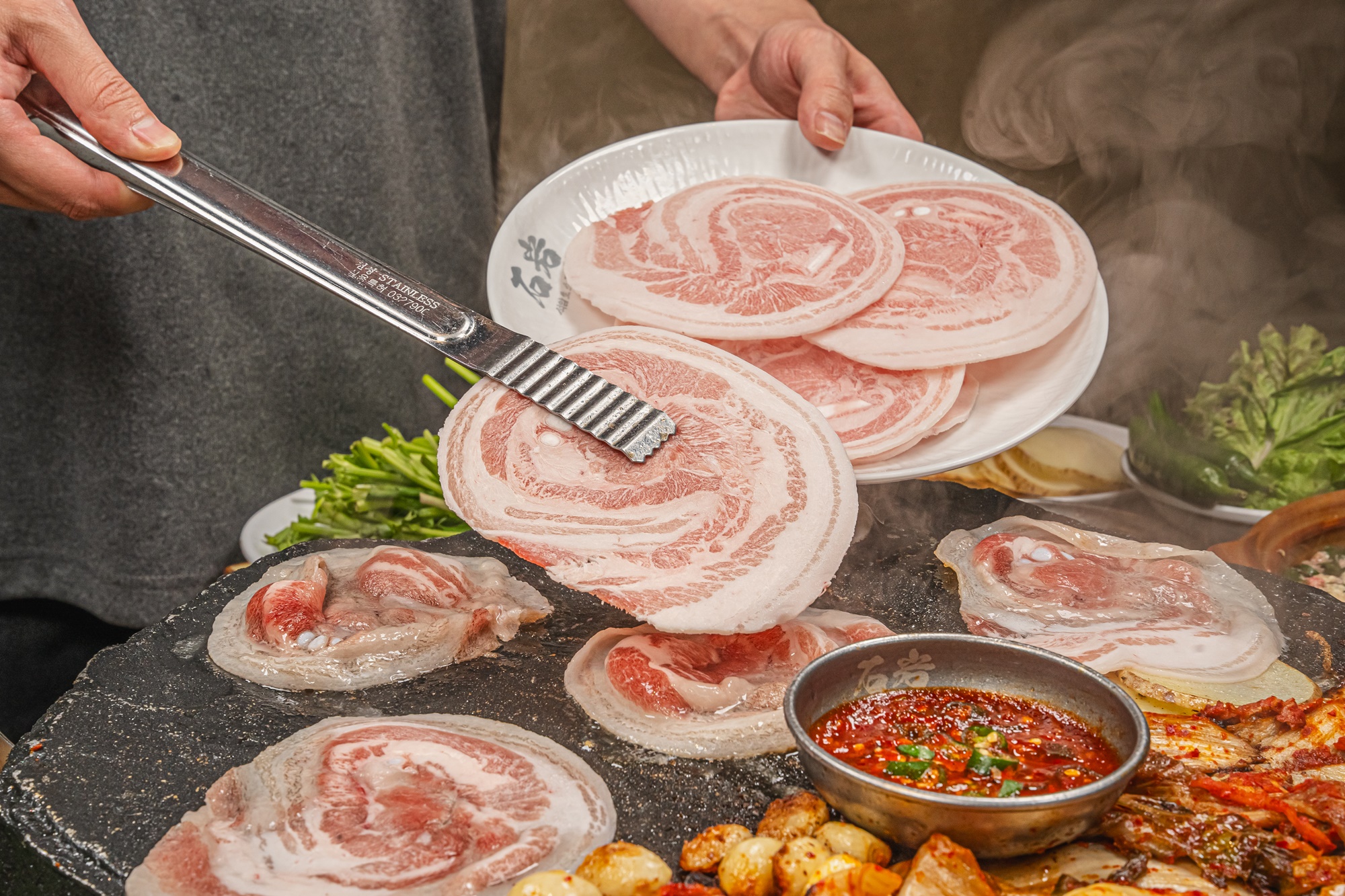 돌판에 구우니 특이하고 신기해요