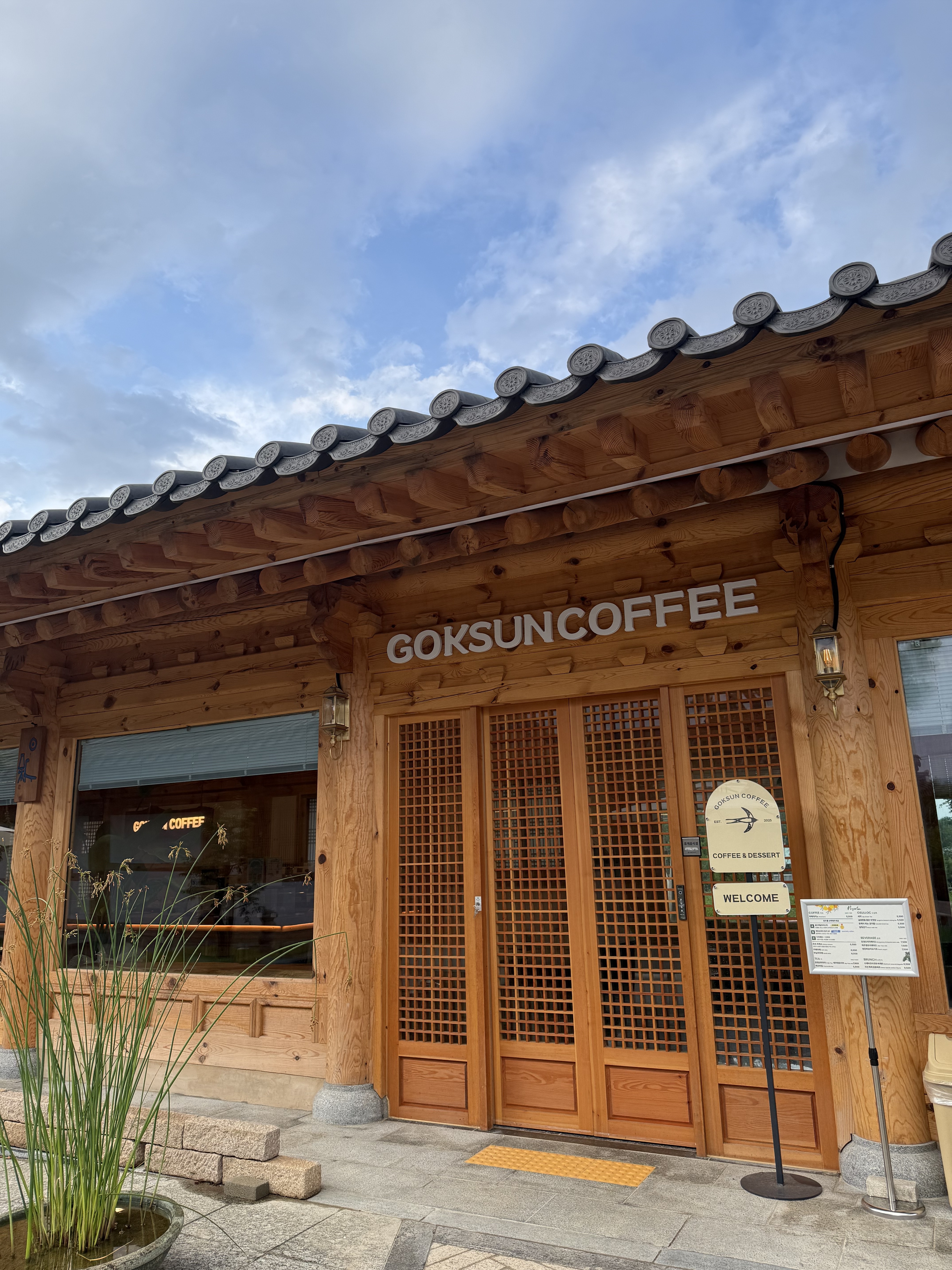 곡선커피는 전통 한옥의 고즈넉한 멋과 현대적인 세련미가 조화를 이루는 카페입니다. 카페 입구에 들어서면 양쪽으로 늘어선 소나무가 마치 공간의 웅장한 프레임처럼 방문객을 맞이하며 저절로 카메라를 들게 만드는 장관을 연출합니다. 마당에는 정원석과 소나무가 어우러져 있고 파란 하늘과 함께 펼쳐지는 풍경은 한 폭의 그림처럼 아름다웠습니다.