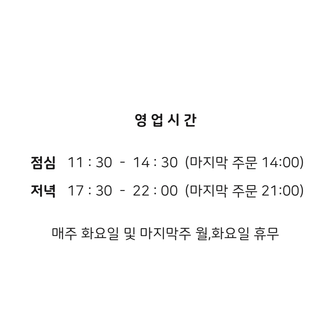 업무시간 : Day: 수, Start: 11:30, End: 22:00Day: 목, Start: 11:30, End: 22:00Day: 금, Start: 11:30, End: 22:00Day: 토, Start: 11:30, End: 22:00Day: 일, Start: 11:30, End: 22:00Day: 월, Start: 11:30, End: 22:00
