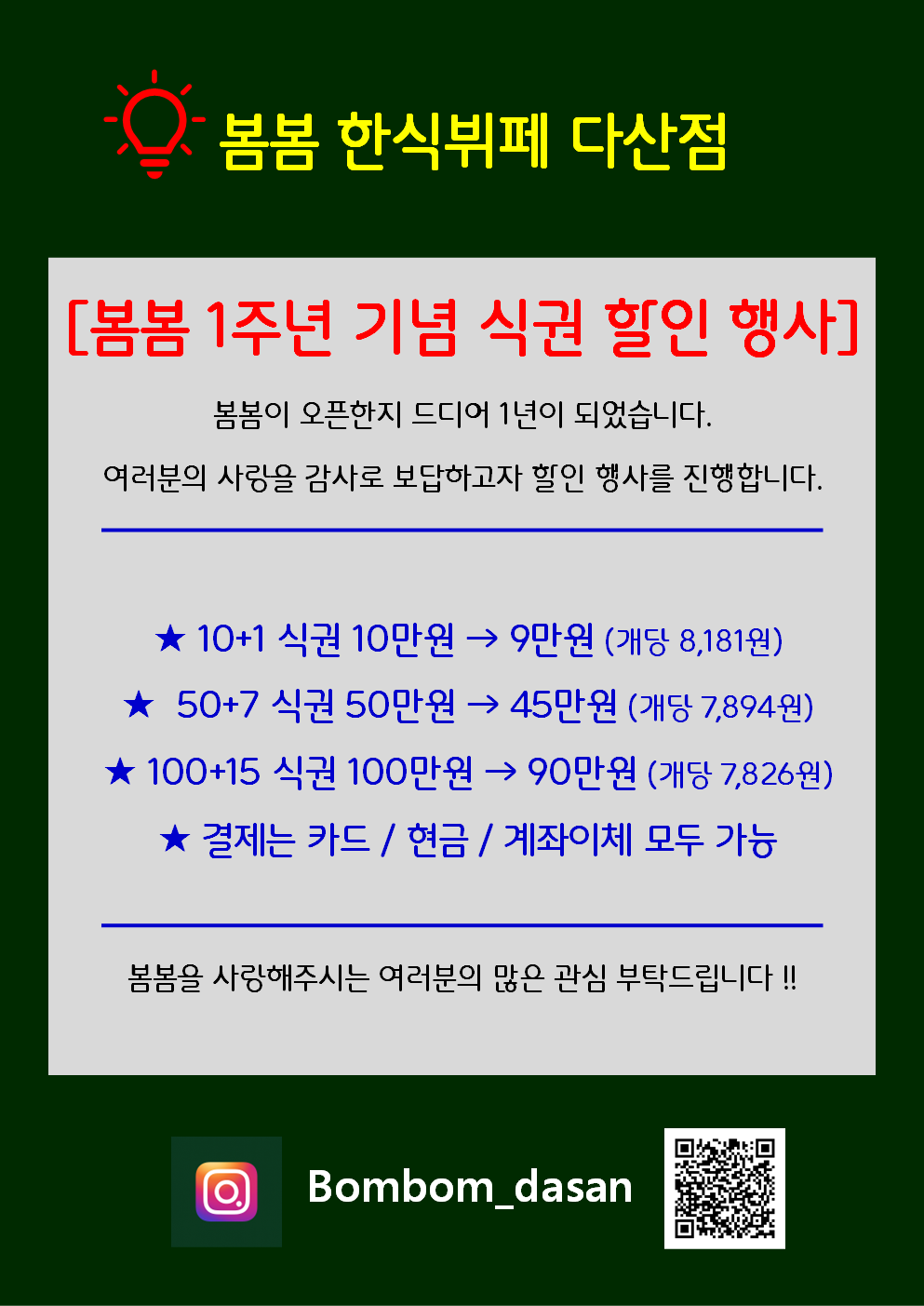 한식뷔페;아동 (7세 이하);초등생;중,고등학생;식권 10개(10+1=9,091원);식권 50매(50+7=8,772원);식권100매(100+15=8,696);