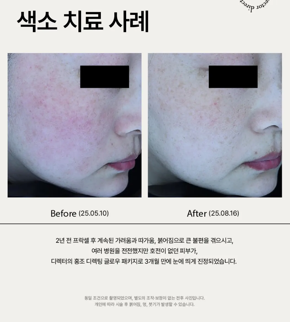 edw**** 작성일여름만 되면 홍조가 진짜 미친 듯이 올라오는 예민한 피부인데, 이번에 치료 받으면서 자극 거의 없이 진행돼서 넘 좋아요... 시술 후마다 진정관리까지 잘 챙겨주셔서 피부가 점점 안정되는 게 느껴지고 지금은 거의 완치된 느낌이라 너무 행복해요ㅜㅜ 디렉터원장님들 모두 감사합니다… ><